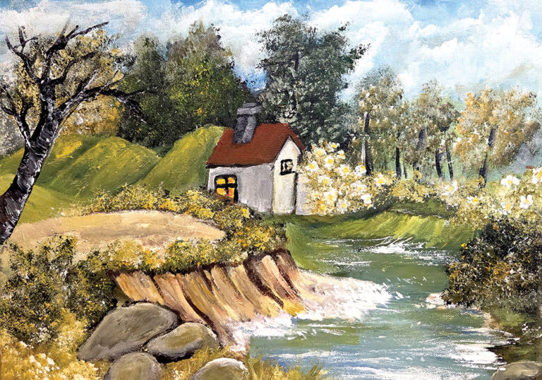 בית קטן ושקט ניצב על גדת פלג זורם, מוקף גבעות ירוקות ועצים רכים באור יום. המפגש בין המבנה האנושי לטבע הפתוח יוצר תחושה של אינטימיות, שלווה וחיים בקצב איטי ומאוזן.