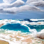 גל גדול נשבר אל החוף ברגע של תנועה חיה ועוצמה רכה. הכחול העמוק מתערבב בקצף לבן, והמים שוטפים את החול בתנועה מחזורית שמרגישה כמו נשימה של הים עצמו. השמיים הבהירים והעננים הרכים מאזנים את האנרגיה שבגל, ויוצרים מפגש בין כוח לשלווה.